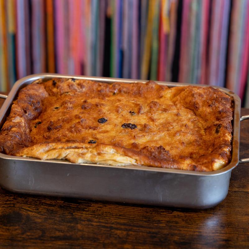 Smooth bread pudding, spiced with cinnamon, clove, and soaked in caramel sauce.